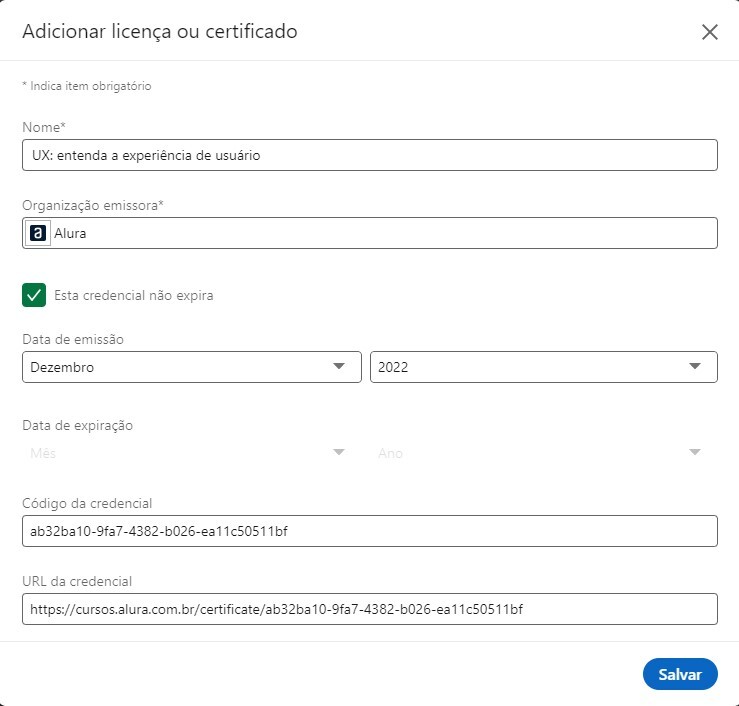 Já em "Código da credencial", apesar de não ser um campo obrigatório, você pode colocar o código que aparece na URL de autenticidade, verticalmente no canto direito do seu certificado, logo depois de "/certificate/";